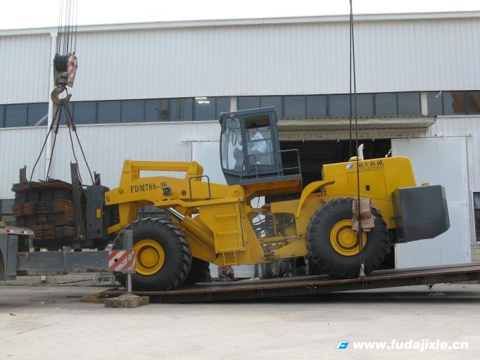 FDM788T-36(36噸)叉裝車是在8噸裝載機基礎上,結合叉裝車功能改進的,自重加載荷達75噸,由于體積大、質(zhì)量重,性能試驗中的穩(wěn)定性、牽引性能、提升能力等關鍵項目試驗的難度高,試驗組人員提前一個多月時間與公司技術人員溝通,做好試驗前的準備工作,確定了試驗方案。用7天時間完成了國家質(zhì)檢總局規(guī)定的型式試驗性能的試驗,并幫助企業(yè)一起分析解決試驗中發(fā)現(xiàn)的問題。